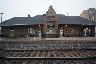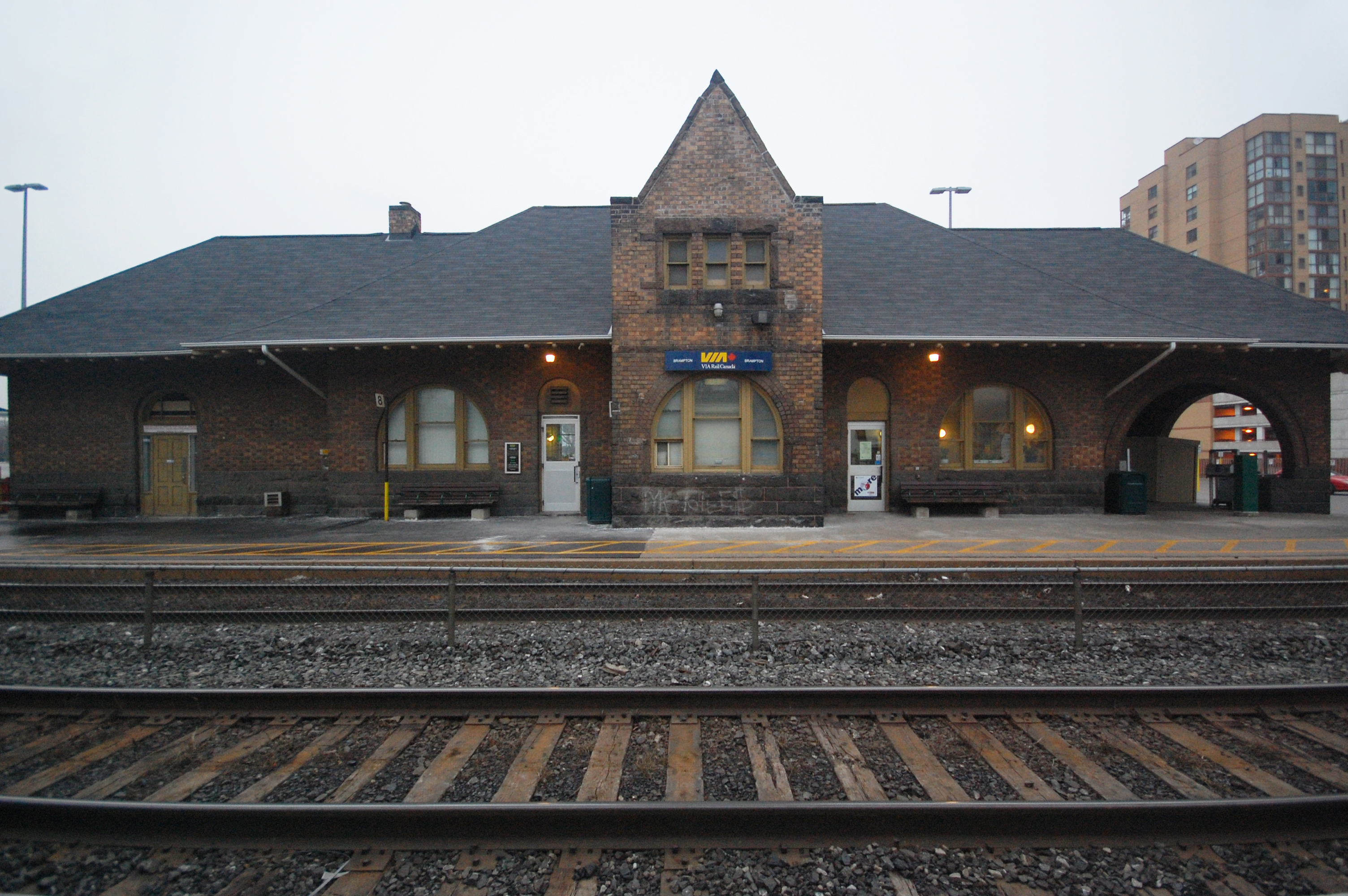 Description: Rear of the railway station building in downtown Brampton, Ontario