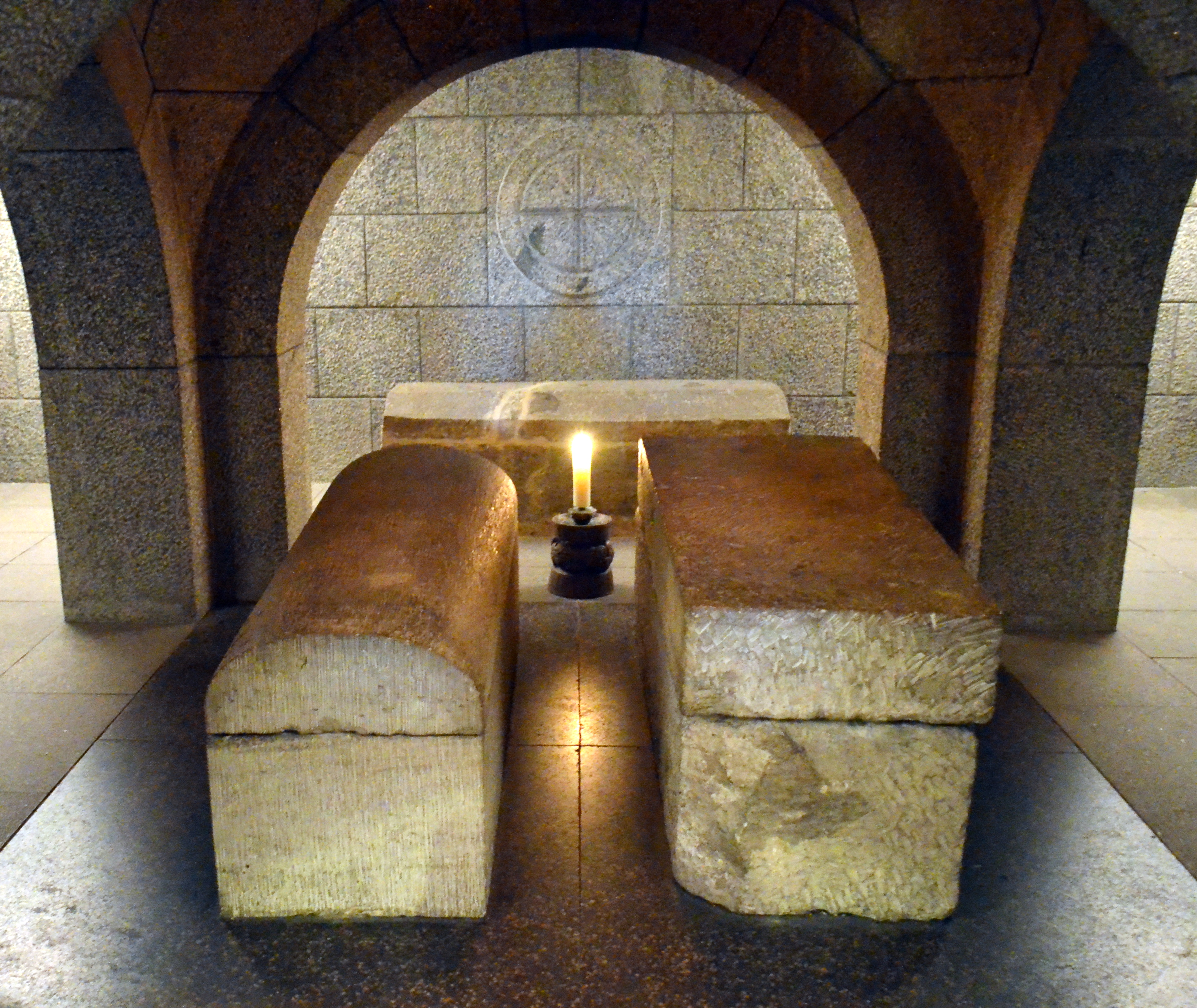 Description: Braunschweig, Braunschweiger Dom: Krypta Heinrichs des Löwen. Links: Sarkophag Heinrichs des Löwen, rechts: Sarkophag seiner zweiten Ehefrau Mathilde Plantagenet. Im Hintergrund ein Sarkophag, in dem sich die sterblichen Überreste mehrerer Brunonen befinden, nämlich: Markgräfin Gertrud († 1077), die um 1030 die erste Domkirche gegründet hatte, Markgraf Ekberts II. von Meißen, und Gertruds von Braunschweig, Schwester Ekberts II. und Urgroßmutter Heinrichs des Löwen. Die Krypta Heinrichs des Löwen wurde erst auf Weisung Adolf Hitlers zwischen 1936 und 1938 von den Architekten Walter und Johannes Krüger geschaffen.