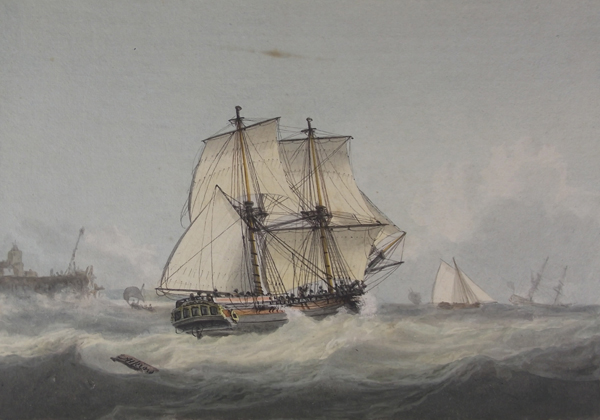 Description: Watercolor of a brig in a breeze off a harbor by Samuel Atkins in the collection at The Mariners' Museum