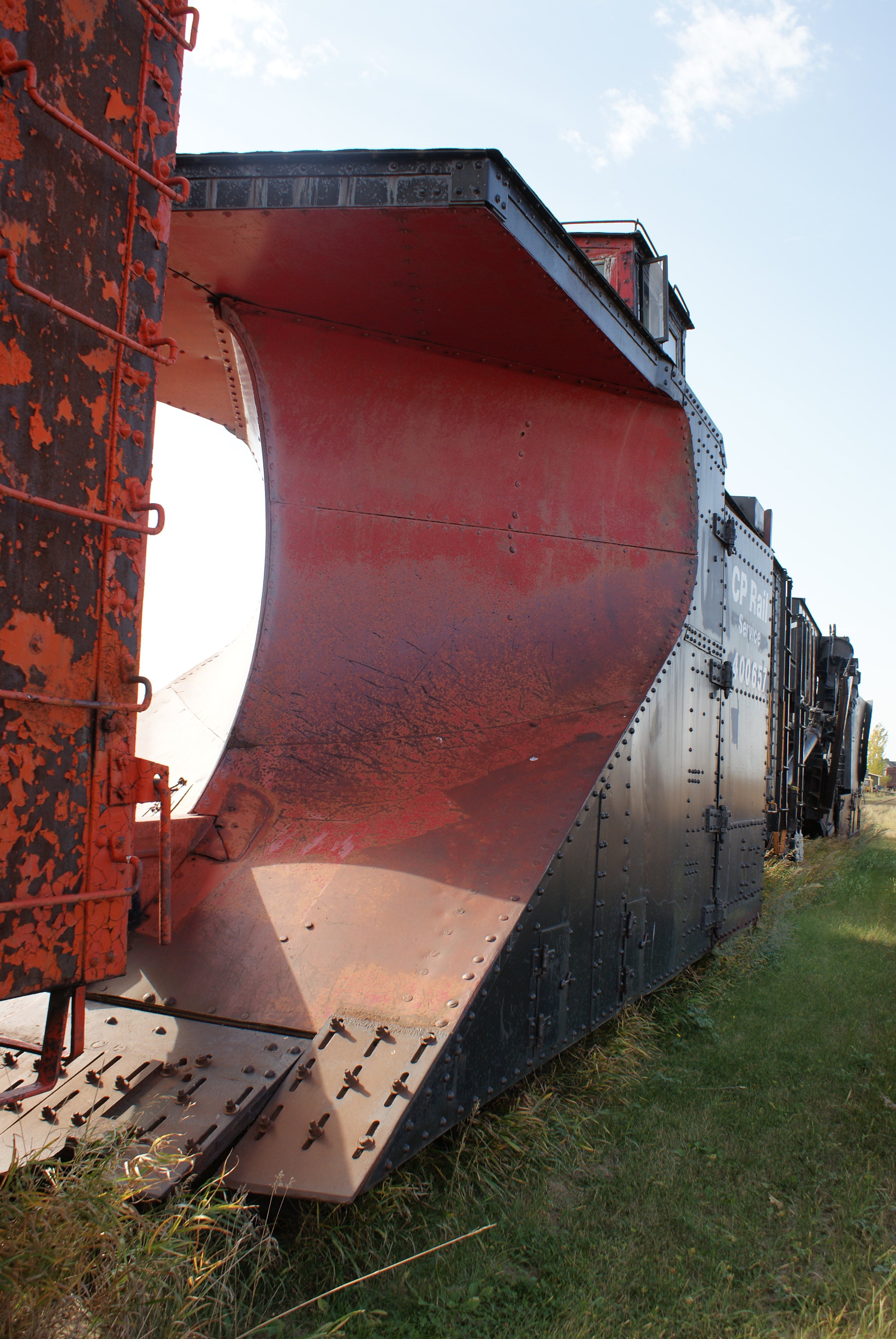 Description: CPR Snow Plough 400657 which pushes snow from the railway tracks. They are pushed forward by the locomotive of the train. This plow was made in 1913 by CPR Angus Shops and was preserved in the Saskatchewan Railway Museum in 1995. The snow plow front blades can be raised and lowered. There are also wings to the side of the snow plow directing snow banks out and away from the train passing on the tracks. The snow plow flanger and foreman within all this blowing snow, had to be able to adjust wings and blades when there were obstacles to the side of the tracks or train crossings to go over. The spring 1996 edition of the Prairie Switcher the newsletter of the Saskatchewan Railroad Historical Society (editor P.J. Kennedy) tells of the experiences of Art Vessey. His father was plough and flanger foreman.