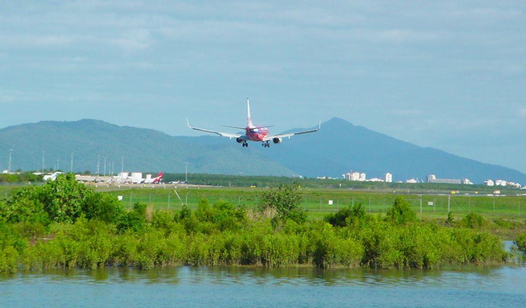 Description: A plane landing to Cairns airport. Taken from behind Barron river.