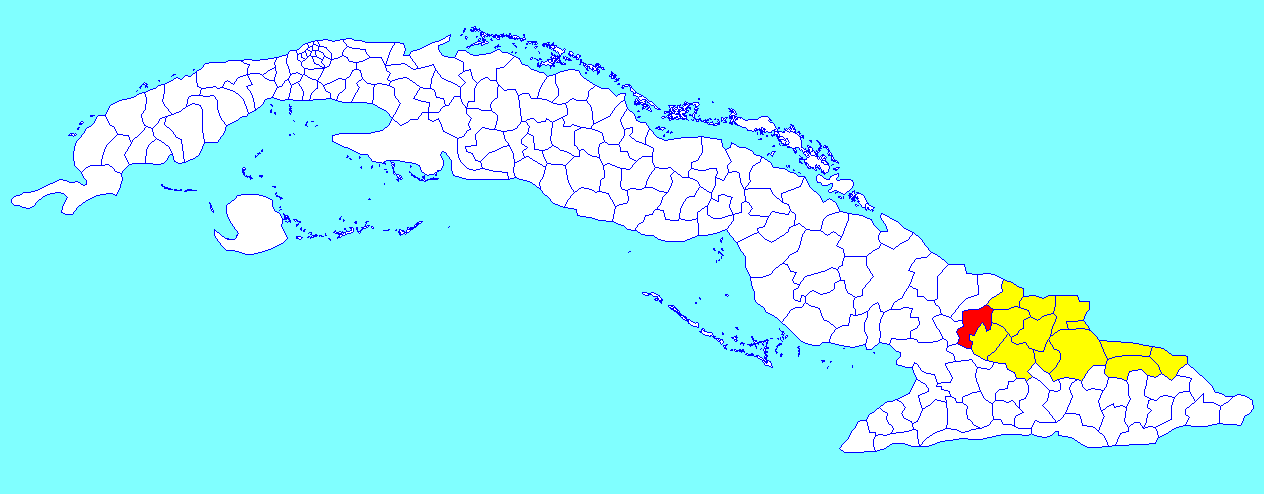 Description: A map of the municipality of Calixto García (shown in red) within the Province of Holguín (yellow) and Cuba.