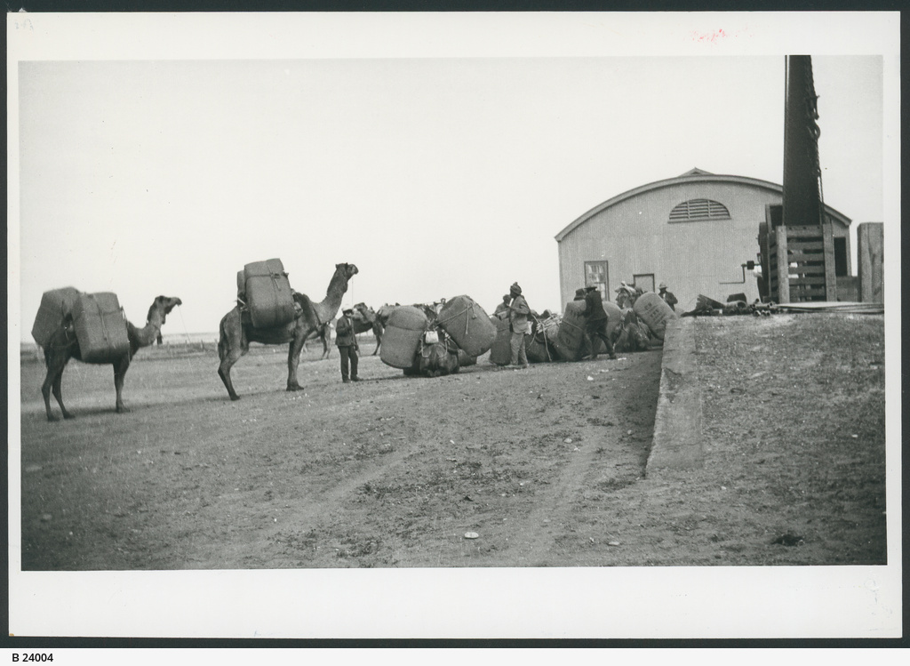 Description: Camel train, with wool from Nappamerry, South Australia being unloaded at the Railway Station. 1928.