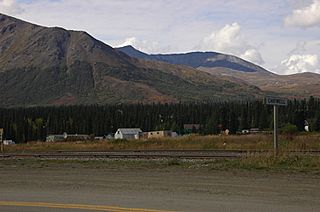 Description: Town of Cantwell, Alaska, with railroad tracks for the Alaska Railroad running in the foreground