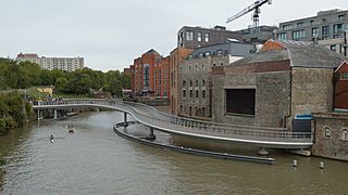 Description: Castle Bridge, a pedestrian bridge from Castle Green to Finzels Reach in Bristol. Costing £2.7 million, developer was Cubex with architects The Bush Consultancy, engineering consultants Clarkebond and fabricator CTS Bridges.[1][2]