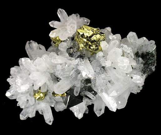 Description: Chalcopyrite, Quartz Locality: Camp Bird Mine, Ouray, Sneffels District (Mount Sneffels District), Ouray County, Colorado, USA (Locality at mindat.org) Size: 5.2 x 3.6 x 2.7 cm. The Camp Bird mine near Ouray, Colorado is one of the most classic of all the Colorado ore body localities. It is celebrated for its superb Chalcopyrite specimens, exhibiting some of the finest twins for the species extant. This specimen features a few superb, sharp, splendent, metallic, brassy-gold colored twinned crystals of Chalcopyrite which are associated with sharp, jet-black Sphalerite crystals sitting atop contrasting white, prismatic Quartz crystals. From the 600’ Stope, 2100’ Level. Ex. Richard Kosnar Collection.