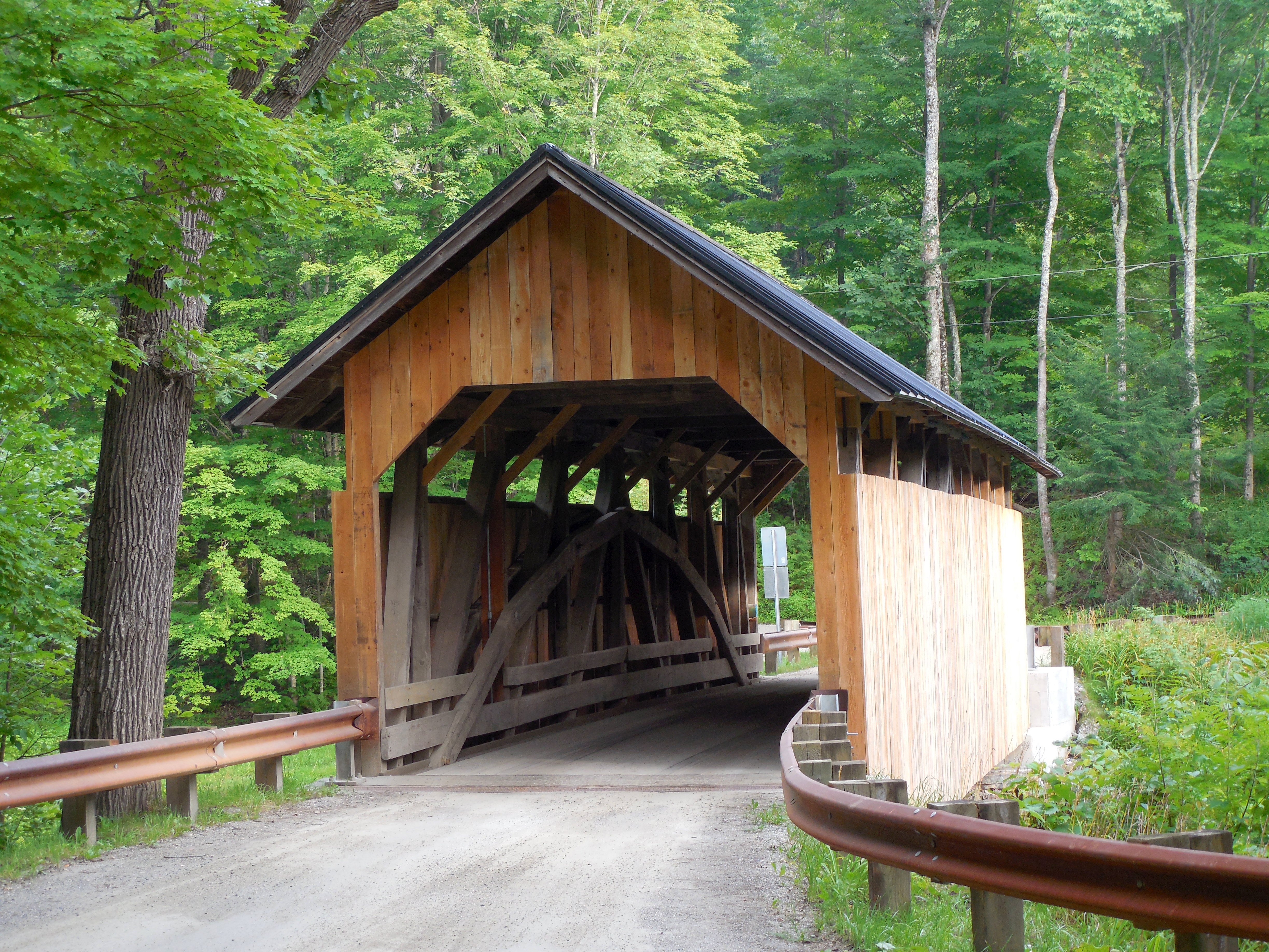 Description: Sequin Covered Bridge (looking southward) on Roscoe Road over the Lewis Creek in Charlotte, Vermont, 2017. Originally constructed in 1849, the bridge was rehabilitated in 2016.