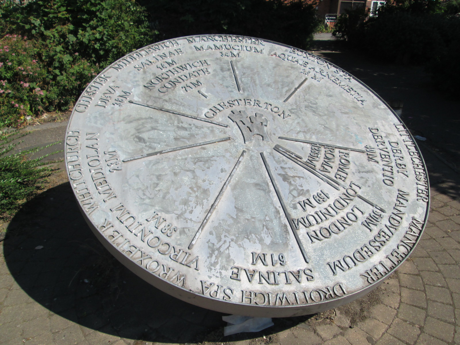 Description: At the corner of London Road and Wolstanton Road in Chesterton, Staffordshire. Set up in 2000. The disc displays direction and mileage (in Roman miles) between Chesterton and places in England, showing names in English and Latin.