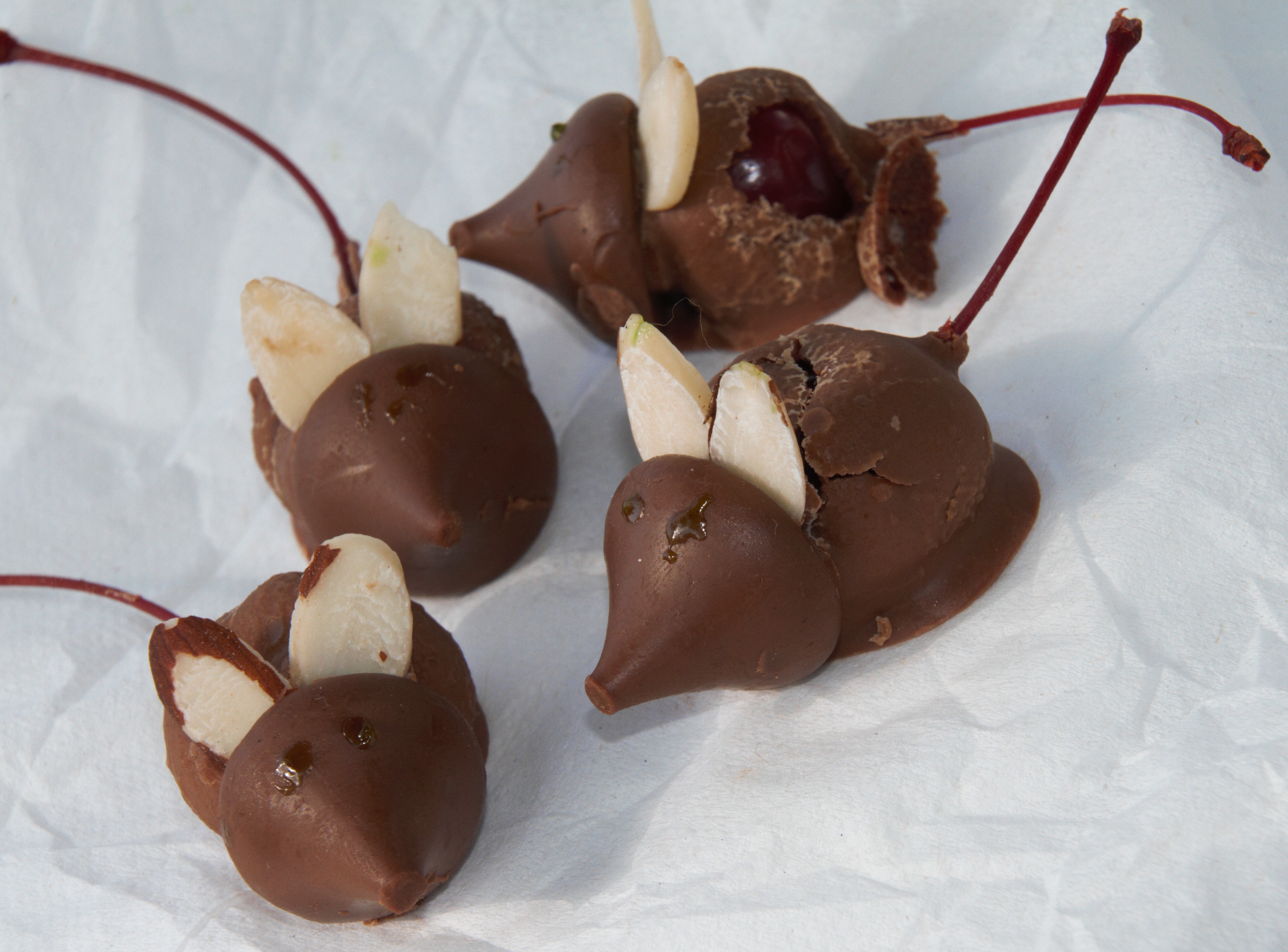 Description: Home-made "mice" made from chocolate covered cherries for bodies, stems for tails, sliced almonds for ears, chocolate kisses for heads, and hardened syrup for eyes