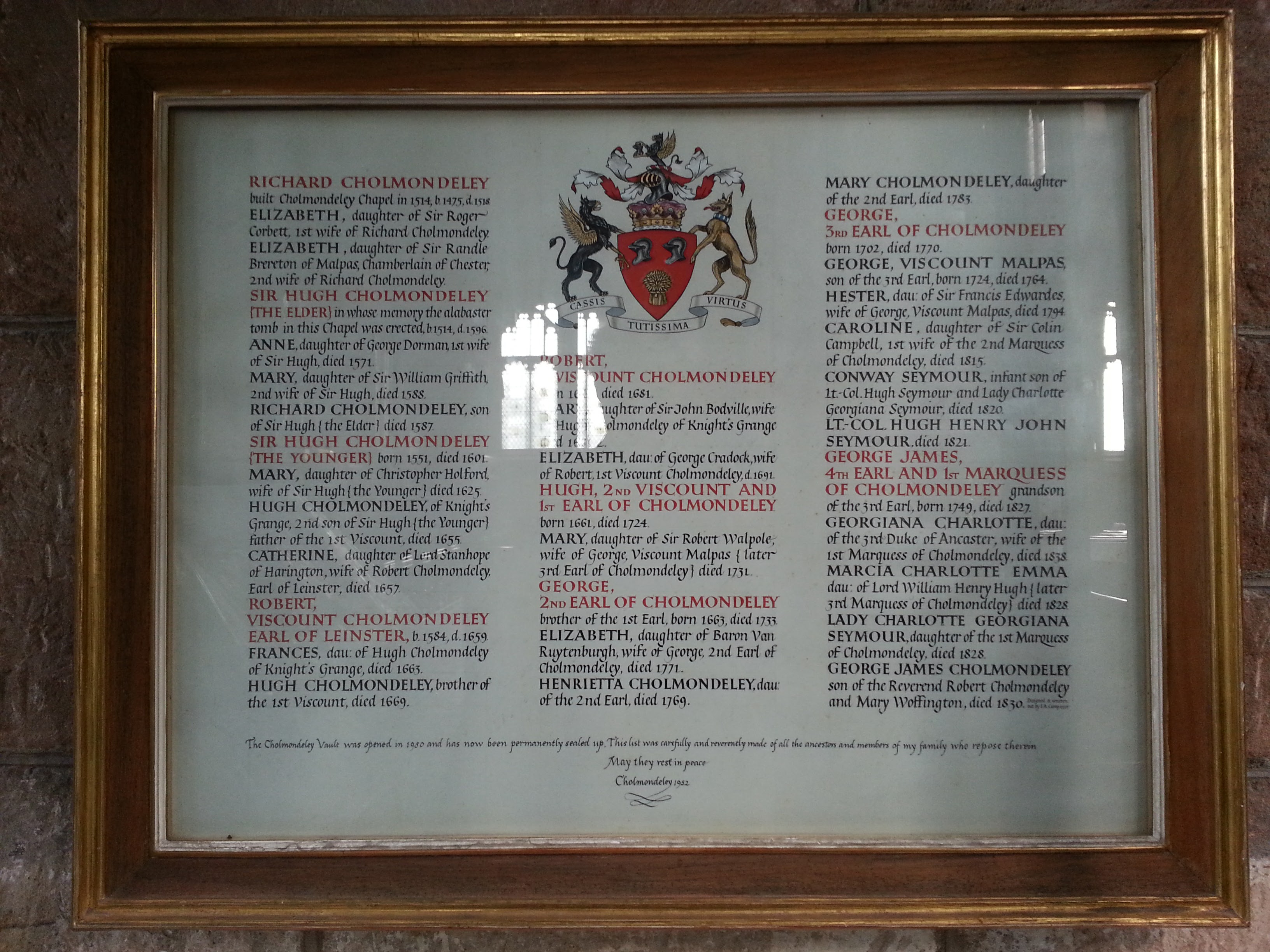 Description: Cholmondeley family interred in St Oswald's Church Vault, Malpas,as displayed in the church, and including: Richard Cholmondeley (1475-1518) Sir Hugh Cholmondeley (The Elder) (1514-1596) Sir Hugh Cholmondeley (The Younger) (1551-1601) Robert Viscount Cholmondeley Earl of Leinster (1584-1659) Robert Viscount Cholmondeley (d. 1681) Hugh, 2nd Viscount and 1st Earl of Cholmondeley (1661-1724) George, 2nd Earl of Cholmondeley (1663-1733) George, 3rd Earl of Cholmondeley (1702-1770) George, 4th Earl and 1st Marquess of Cholmondeley (1749-1827)