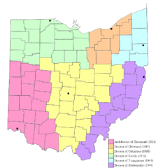 Description: Map of the Ecclesiastical province of Cincinnati. Diocesan map of Ohio with the Diocese of Cleveland in tan. Diocesan map of Ohio with the Diocese of Columbus in light yellow. Diocesan map of Ohio with the Diocese of Steubenville in turquoise. Diocesan map of Ohio with the Diocese of Toledo in light green.
