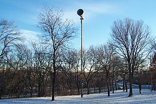 Description: Copyright © 2009 Fedsigtbolt An example of a civil defense siren (also called a warning siren or tornado siren), found at Baran Park in Milwaukee. This model is a Tempest (T)-135 from Milwaukee based American Signal Corporation (ASC) (formaly known as ACA) which has an acoustical rating of 135 dB @ 100 feet, and has been recently modified with lower horsepower motor & battery backup This siren always comes in the color gray and rarely you see it in the form of yellow. This model of siren has been recently updated with a Shorter projector horn. They now all have battery backup and are known as the ASC T-135 AC/DC. Both versions are the largest and loudest in production today