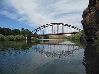 Description: Bridge over the John Day River on Oregon Route 218 at Clarno Recreation Site in Wheeler County, Oregon, United States