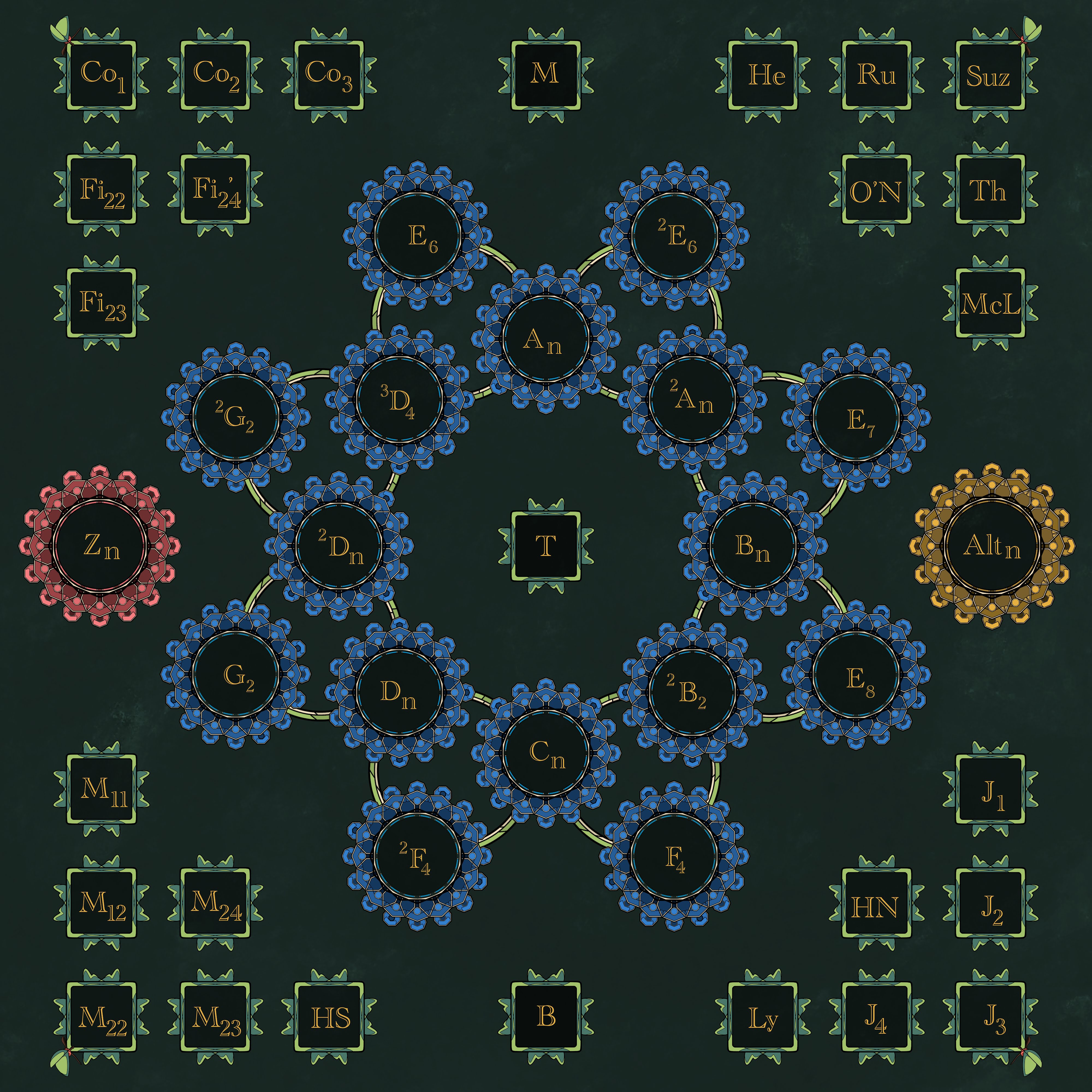Description: This picture summarizes the classification of the finite simple groups.