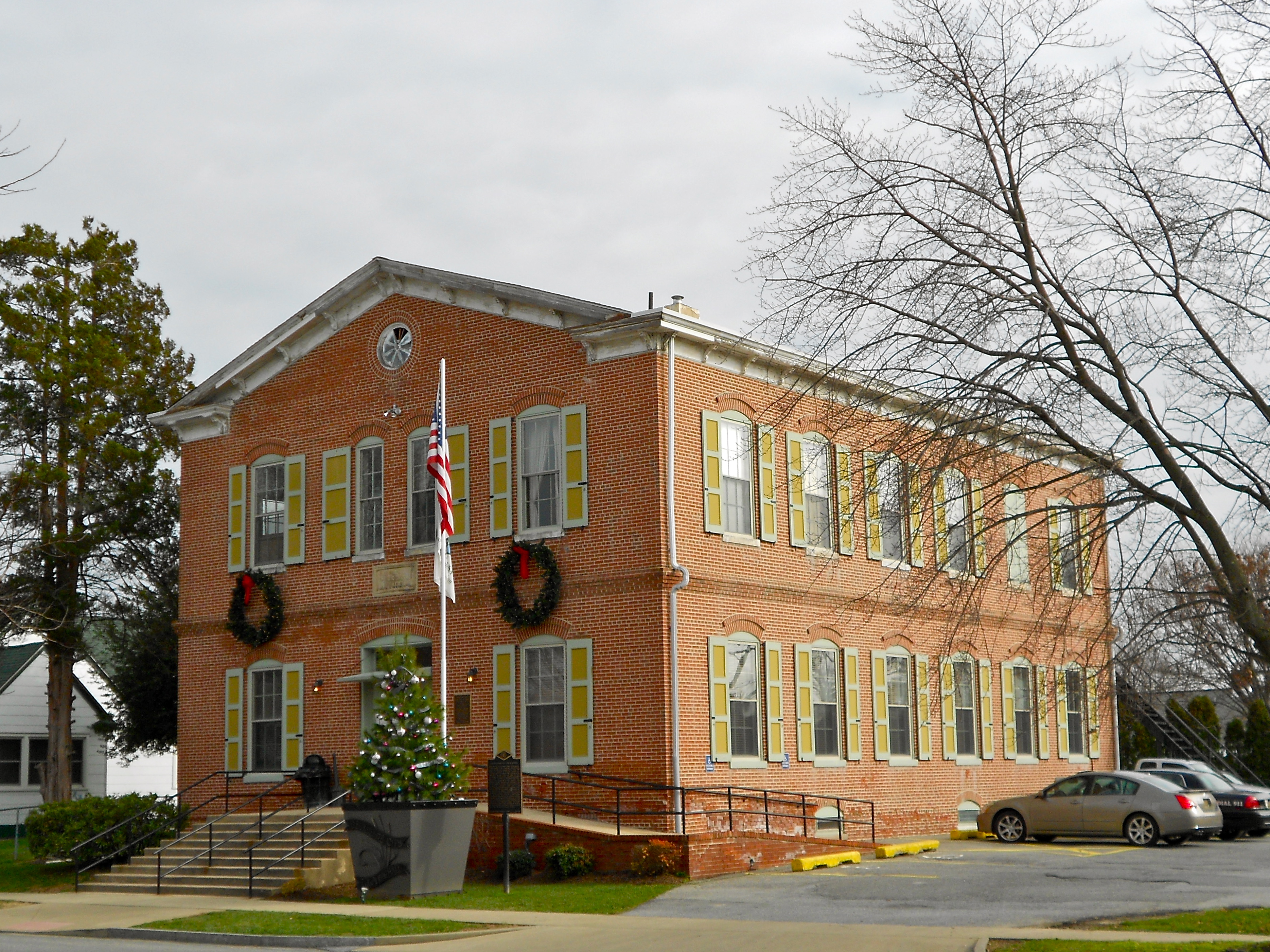 Description: Old school and town hall in the Delaware City Historic District (on the NRHP since December 15, 1983) The historic district is roughly bounded by the Delaware River, Dragon Creek, Delaware Route 9, and the Delaware and Chesapeake Canals in Delaware City, New Castle County, Delaware.