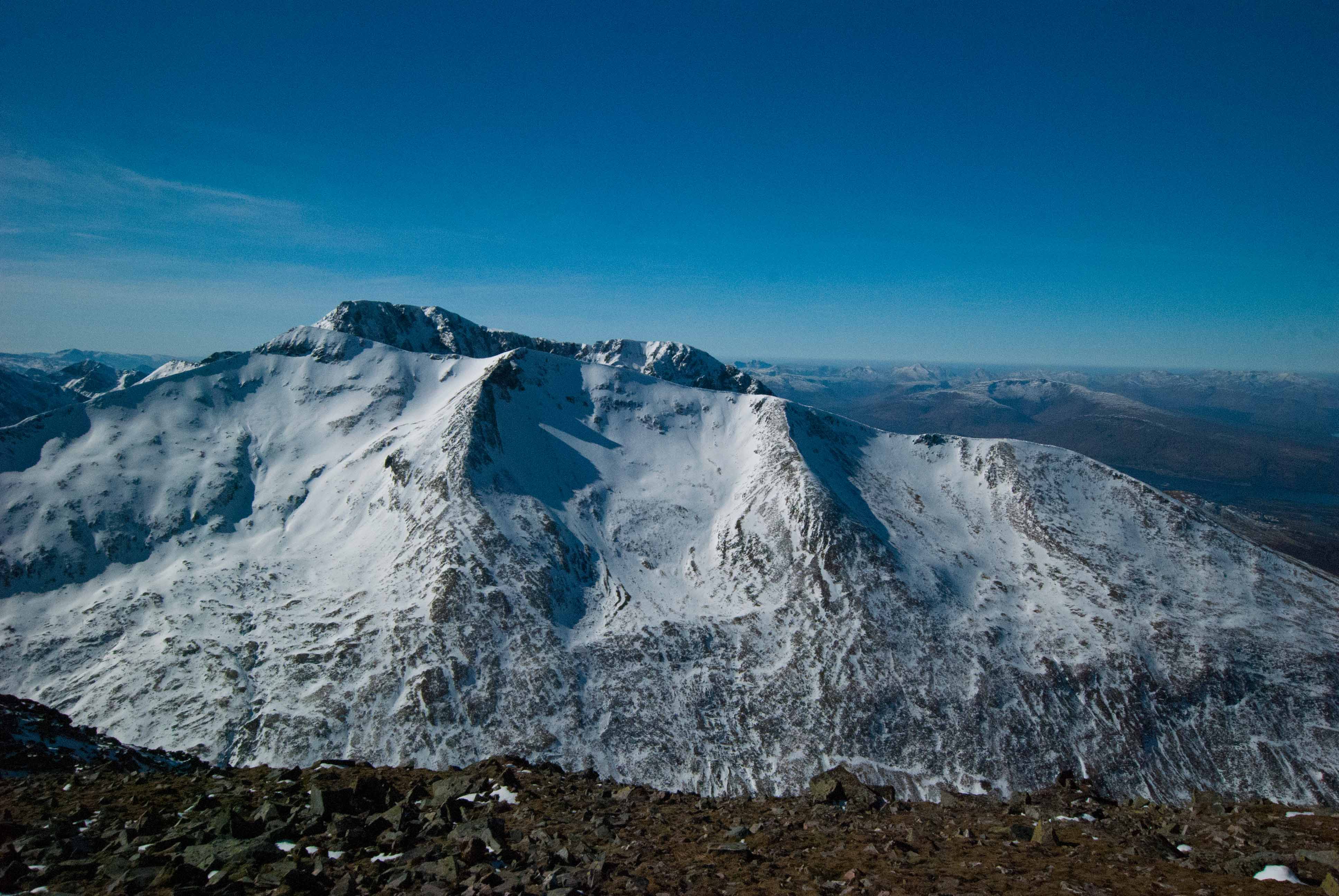 Description: Carn Mor Dearg as seen from Aonach Mor showing the snow bowl that attract off piste snowsports enthusiasts. Taken late winter with a poor snow cover. Ben Nevis is behind