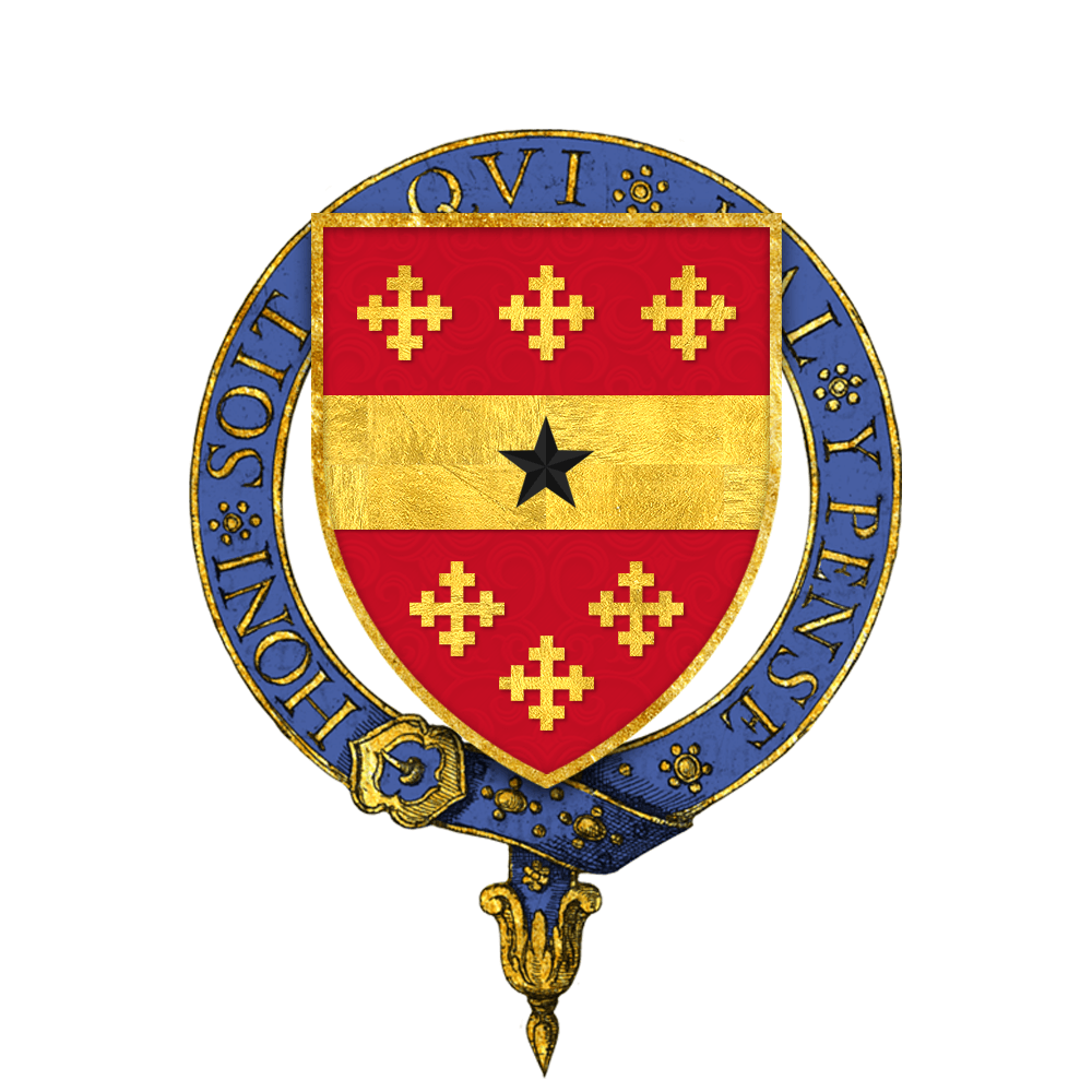 Description: Coat of Arms of Sir John de Beauchamp, KG “ John Lord Beauchamp de Warwick…Arms: Gules, a fess between six cross-crosslets Or, a mullet for difference. ” BELTZ, George Frederick, Memorials of the Order of the Garter from Its Foundation to the Present Time, London: William Pickering, 1841.