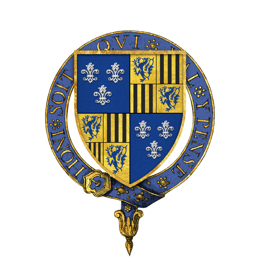 Description: Sir Thomas Burgh, KG HOPE, W. H. St. John, The Stall Plates of the Knights of the Order of the Garter 1348 – 1485: A Series of Ninety Full-Sized Coloured Facsimiles with Descriptive Notes and Historical Introductions, Westminster: Archibald Constable and Company LTD, 1901.“ Plate LXXXVII - Sir Thomas Burgh, Lord Burgh of Gainsborough, K.G. 1483-1496... The shield is quarterly: 1 and 4, azure three fleur-de-lis ermine (for Burgh); 2 and 3, gold a lion azure (for Percy) quartering gold three pales sable (for Strabolgi). ” The Stall plate remains intact within the twentieth stall, on the Prince's side of the chapel.