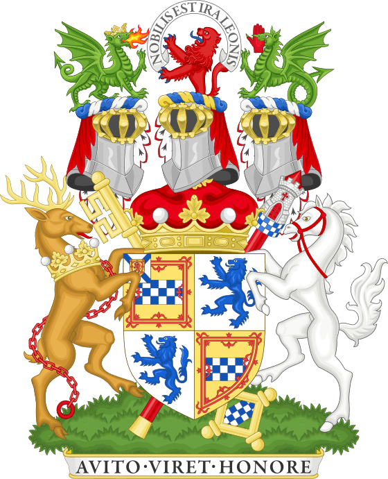 Credit: Own work. This file was derived from: Arms of James Stewart, 1st Earl of Moray.svg Coat of Arms of Mary of Teck.svg Arms of Nova Scotia.svg Coat of Arms of the Duke of Norfolk, the Earl Marshal.svg Coronet of a British Marquess.svg Coat of Arms of the College of Arms.svg Prince of Wales' Red Dragon.svg Coat of Arms of Catherine of Braganza.svg Badge of the March Pursuivant.svg Arms of Margaret Thatcher, The Baroness Thatcher (Variant).svg Royal Coat of Arms of the United Kingdom.svg Coat of Arms of John of Austria (1545-1578).svg