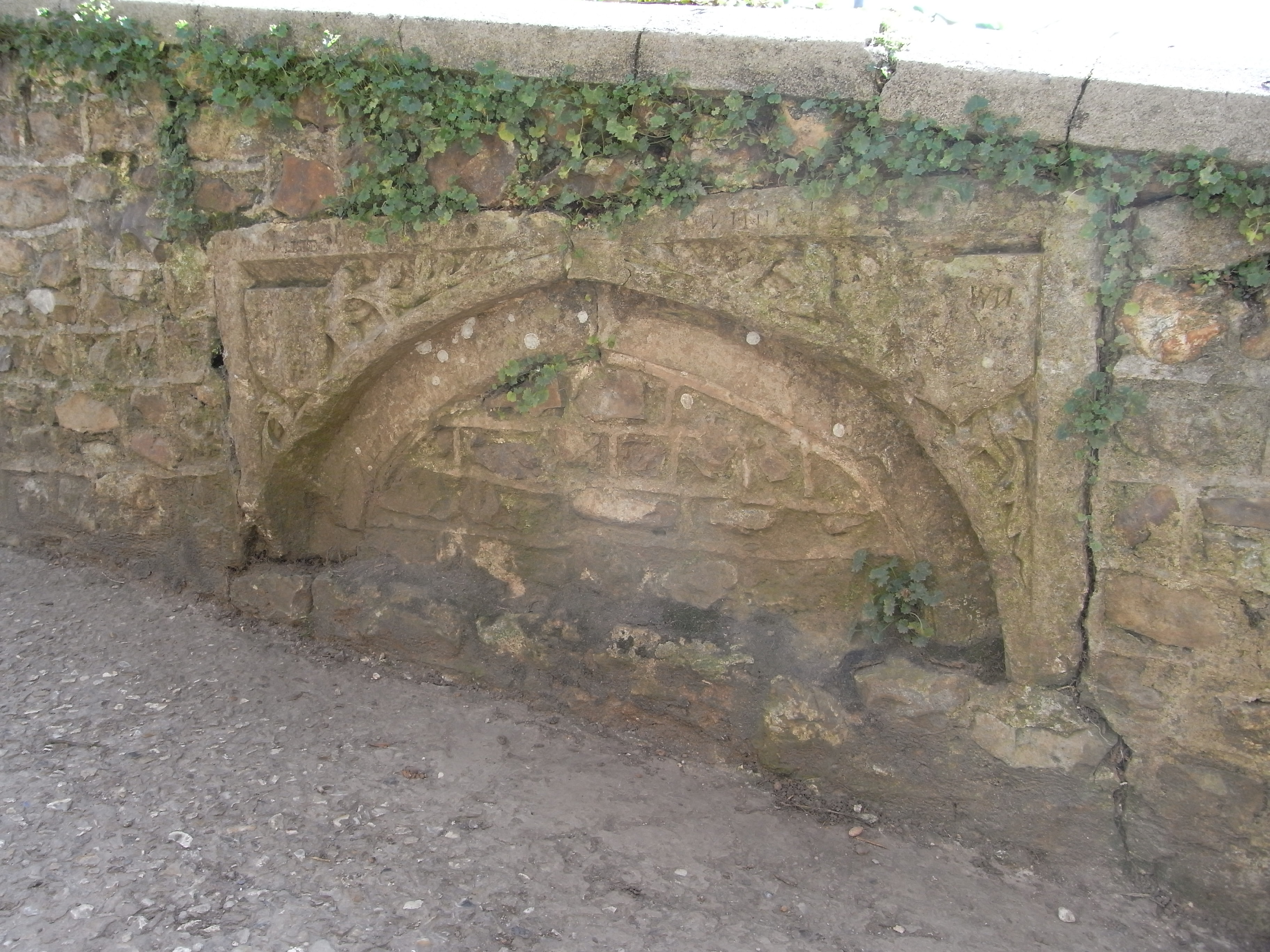 Description: Ancient stone Tudor-arch from window with heraldic shields at each side, heraldry worn away, formerly part of Colcombe Castle, Colyton, Devon, now set into low parapet of footbridgr over leat of Colcombe Abbey Farm