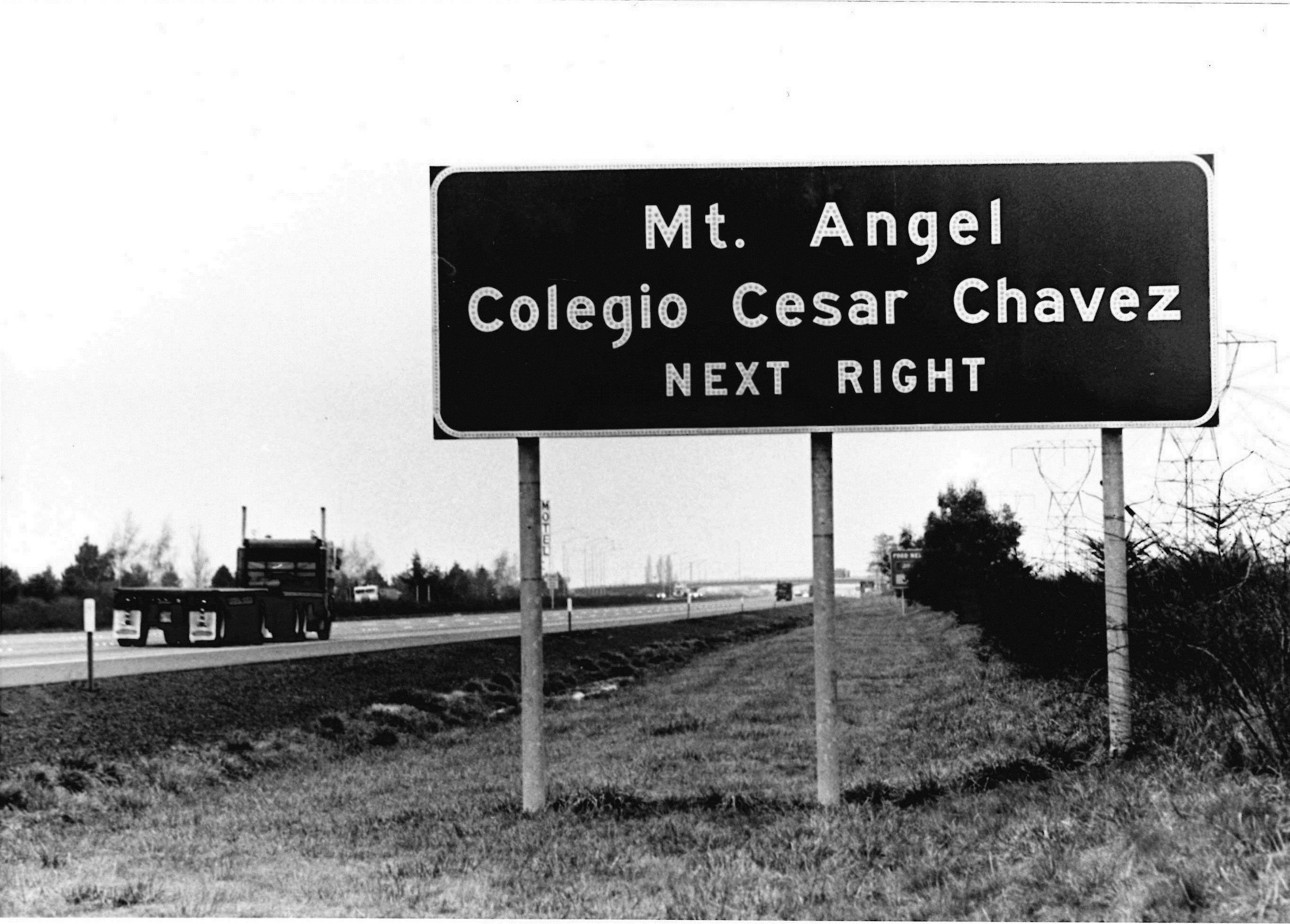 Description: Road sign advertising Colegio Cesar Chavez in Mount Angel, Oregon.