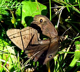 Description: Common Wood-nymphs (Cercyonis pegala nephele), mating, Fort St. Joseph National Historic Site of Canada, Jocelyn, Ontario, Canada