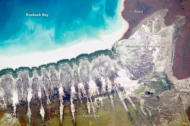 Description: This photograph taken from the International Space Station shows striking shoreline patterns at Roebuck Bay, on the coast of the desert landscape of Western Australia. The indents along the shoreline (center and left) are points where small, straight streams reach the bay. Even smaller tributaries give a feathered appearance to this shoreline. By contrast, the more typical meandering channel patterns of coastal wetlands appear on the top right. Almost no human-built patterns are visible in the scene, even though the town of Broome lies just outside the image on the top right. The exceptions are the few fence lines crossing the straight streams in the bottom third of the image. The regularity of the stream pattern seems to have its origin in the surrounding inland areas. Several inland dunefields show the same pattern of parallel “linear dunes.” Interestingly, the dunes are spaced roughly the same distance apart as the parcels of land between the straight streams at the coast. Both the dunes and the straight streams are aligned with the dominant winds out of the east. (Note that north is to the upper right.) It seems likely that dunes once occupied the bay shore and may have controlled the spacing and linearity on the straight streams. The phenomenon of streams forming in the parallel lows between linear dunes is well known in desert landscapes. In all, this photograph shows about fifteen kilometers (10 miles) of coastline along Roebuck Bay. The bay also can be spotted in the lower left corner of this panoramic view taken from the Space Station on an earlier mission.