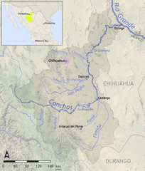 Description: Map of the Rio Conchos drainage basin, in Chihuahua, Mexico. Made using SRTM and OpenStreetMap data.