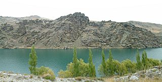 Description: Rock formations in the Cromwell Gorge between Cromwell and Clyde. The lake is Lake Dunstan which is in fact man-made to create the nearby Clyde Dam.