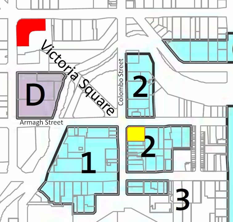 Description: Area around Victoria Square showing planning designations, with the Forsyth Barr Building land highlighted within designation 2 (Performing Arts Precinct). The shape of the former Crowne Plaza hotel is shown in red.