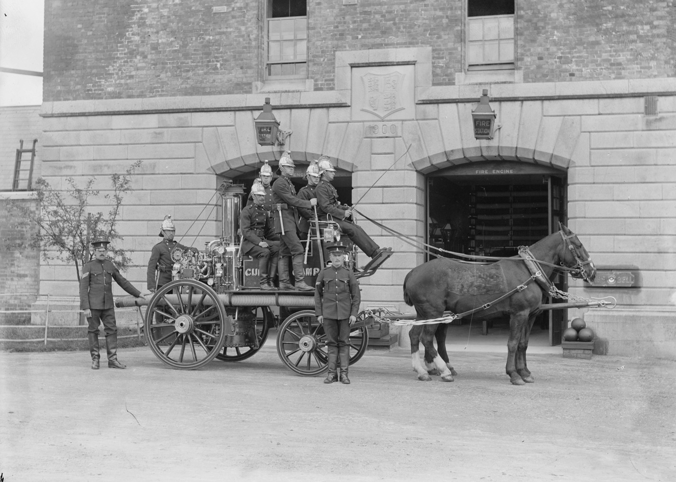 Description: Shiny and gleaming (new?) horse-drawn fire tender at the Curragh Camp, Co. Kildare. The men have FB, presumably for Fire Brigade, on their uniform collars and as an emblem on their gorgeously ornate helmets, and absolutely love the special belt holders for their fire axes. Thanks to Gerry Ward for help with the make of the fire engine! It's Shand, Mason & Co., London. Date: Circa 1902 NLI Ref.: EAS_2467