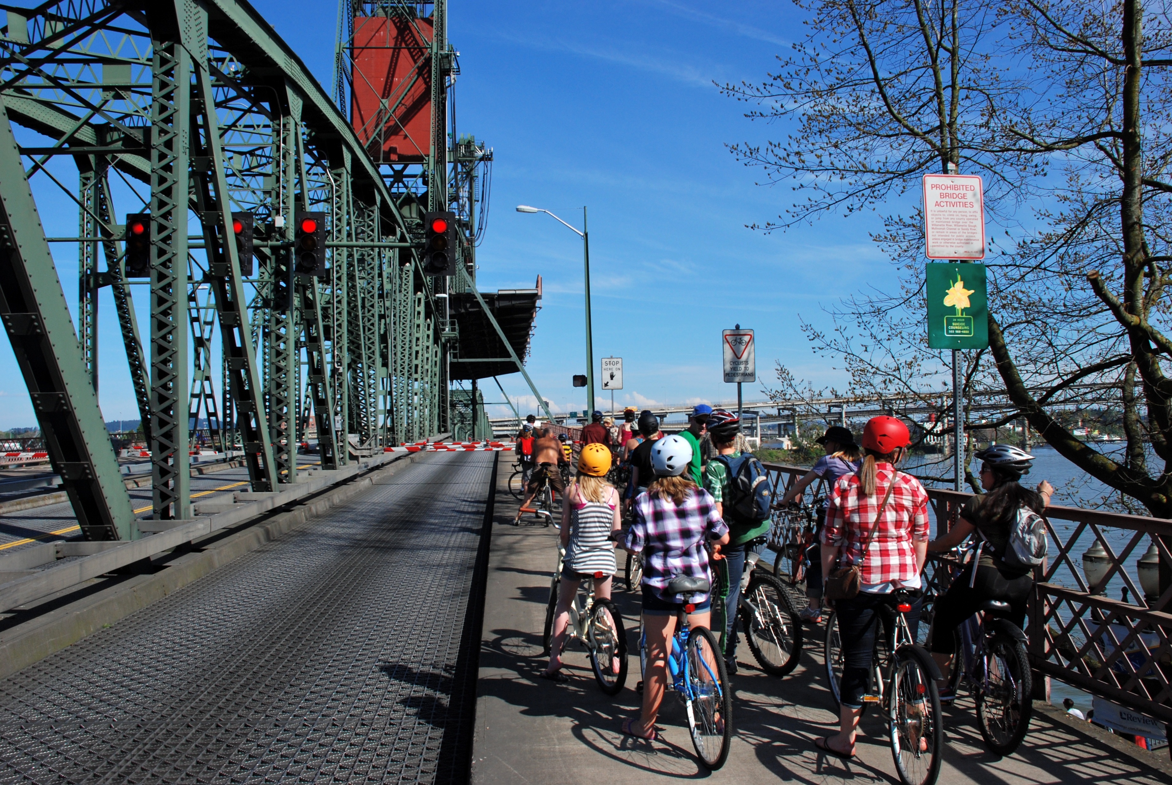 Title: Cyclists waiting on Hawthorne Bridge during a lift