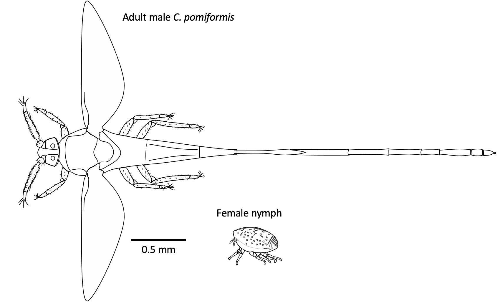 Description: Adult male pomiformis with female nymph (drawn to scale).