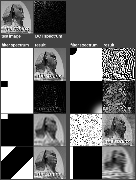 Description: This image shows the effect of applying eight different filters on a test image by multiplying the spectra obtained with discrete cosine transform (DCT). Common effect such as low-pass and high-pass can be seen. I created the image completely myself, using my own photo and Aileron font (CC0, by dot colon) and I release it under CC0. I used GIMP and GNU Octave. The Octave command used to filter the image is (consider CC0 as well): pkg load signal; for i = 1:24, img = uint8(idct2(dct2(double(rgb2gray(imread("~/Documents/fft dct examples/test.png")))) .* rgb2gray(double(imread(strcat("~/Documents/fft dct examples/filter",num2str(i),".png")))))); imwrite(img,strcat("~/Documents/fft dct examples/result",num2str(i),".png")); end The spectrum image is displayed directly without any smart mapping with: imshow(uint8(dct2(rgb2gray(imread("~/Documents/fft dct examples/test.png"))))) Therefore the values are cropped and the spectrum image loses some information about the original image. It is there only to give an idea about what the spectrum looks like.
