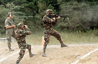 Description: Sergeant Ronald Mann of the 1314th Ground Combat Readiness and Evaluation Squadron fires an M60 machine gun from the standing position during the DEFENDER CHALLENGE '88 competition. Location: LITTLE ROCK AIR FORCE BASE, ARKANSAS (AR) UNITED STATES OF AMERICA (USA). Camera Operator: STAFF SERGEANT JOHN K. MCDOWELL. Date Shot: 26 Aug 1988.
