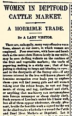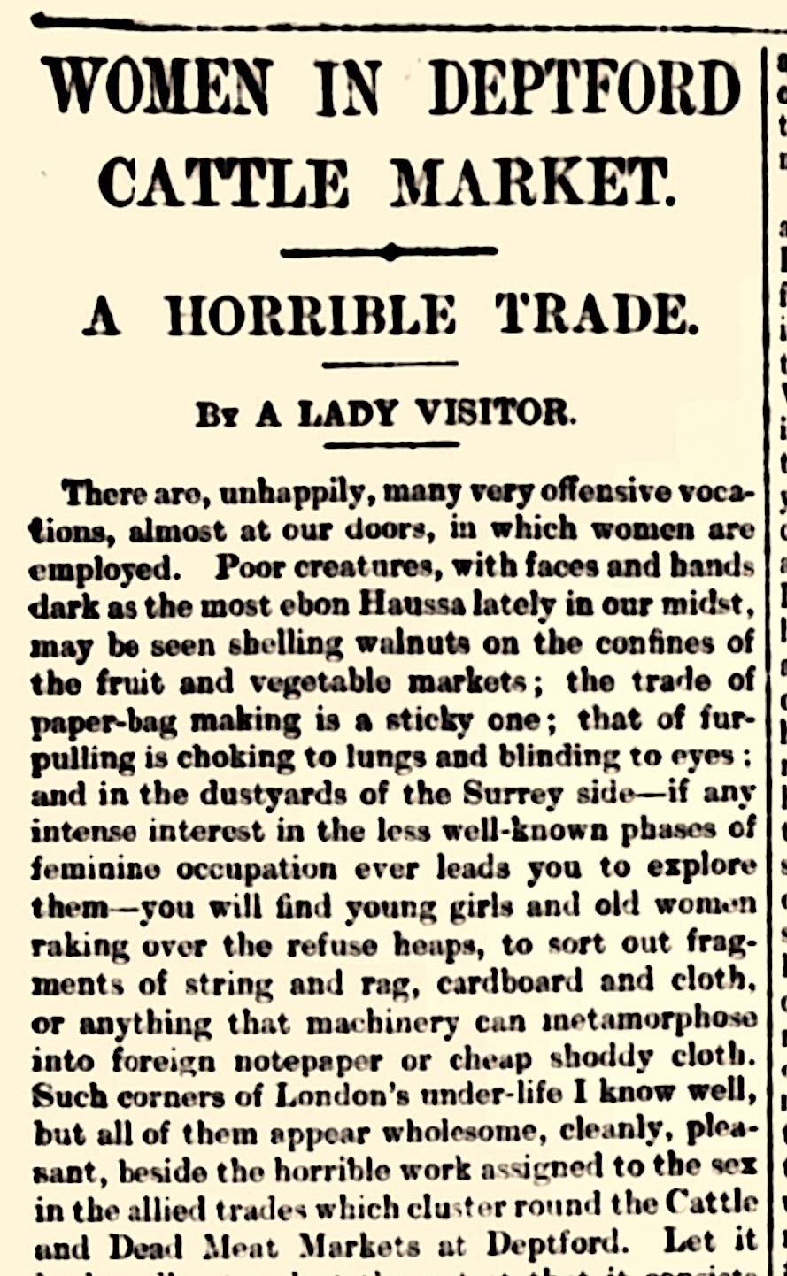 Description: An article by "A Lady Visitor" (possibly a Mrs Lamert, charity activist and secretary of the Deptford Fund) criticises working conditions for women and girls at the Foreign Cattle Market, Deptford.
