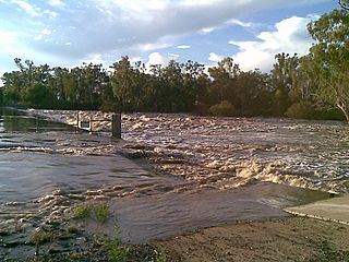 Description: The Dawson River at the Moura Weir (7 260 ML) - overflowing after heavy rains, approx 8 km west of the township of Moura, Queensland.