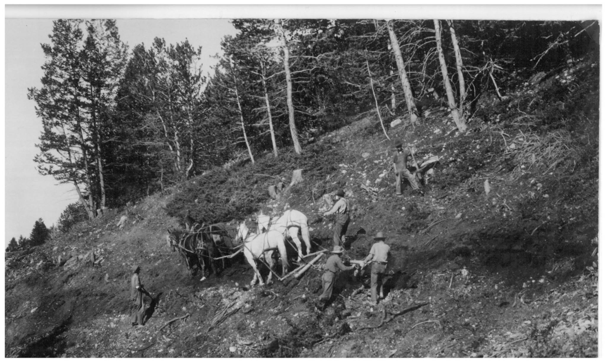 Description: U S Highway 14 is being reconstructed this summer. Be prepared for delays between Burgess Junction and Granite Pass. This photo shows construction of the Dayton-Kane road across the Bighorns in the 1920s.