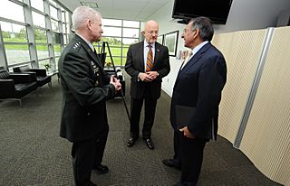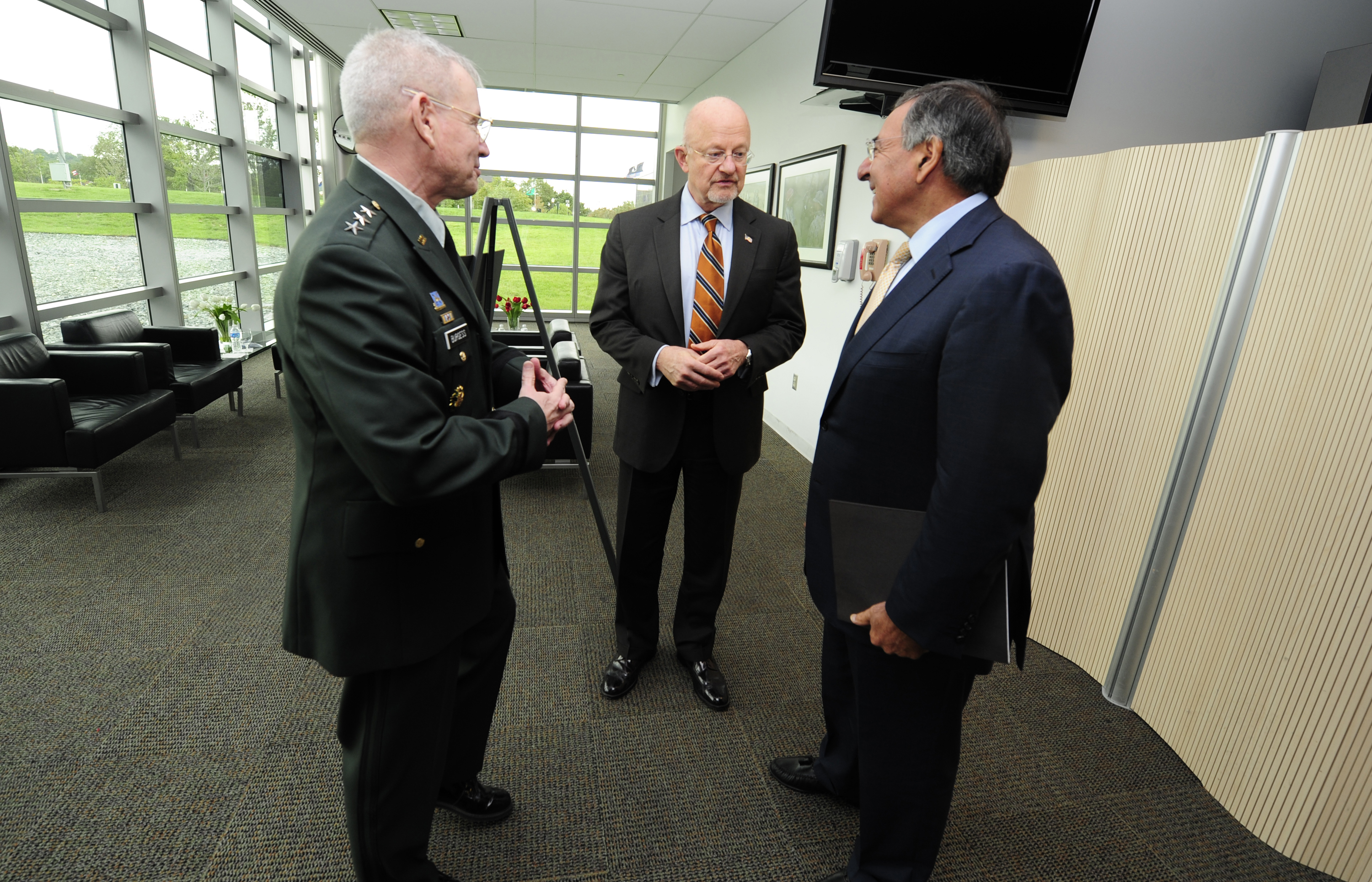 Description: Defense Secretary Leon E. Panetta meets with James Clapper Jr., center, director of National Intelligence, and Lt. Gen. Ronald Burgess Jr., director of the Defense Intelligence Agency, before the agency's 50th anniversary commemoration ceremony on Joint Base Anacostia-Bolling in Washington, D.C., Sept. 29, 2011.