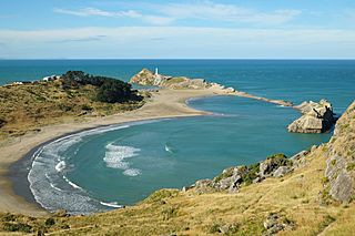 Description: Deliverance Cove and Castlepoint lighthouse; residential houses from the Castlepoint village visible on the left