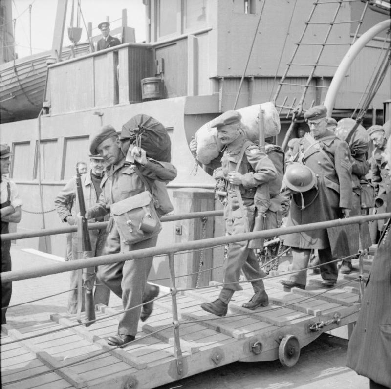 Description: Demobilisation of the British Army At Dover, Private Bill Krepper (middle) of the Pioneer Corps disembarks from a troopship.