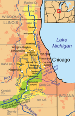 Description: Map of the Des Plaines River drainage basin. The drainage basin is in yellow. Urbanized areas are in red.