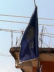 Description: A blue flag with dhamma wheel and 'Bhim' name representing Dalit-Buddhist culture at Indira Nager, Chinawal village, India