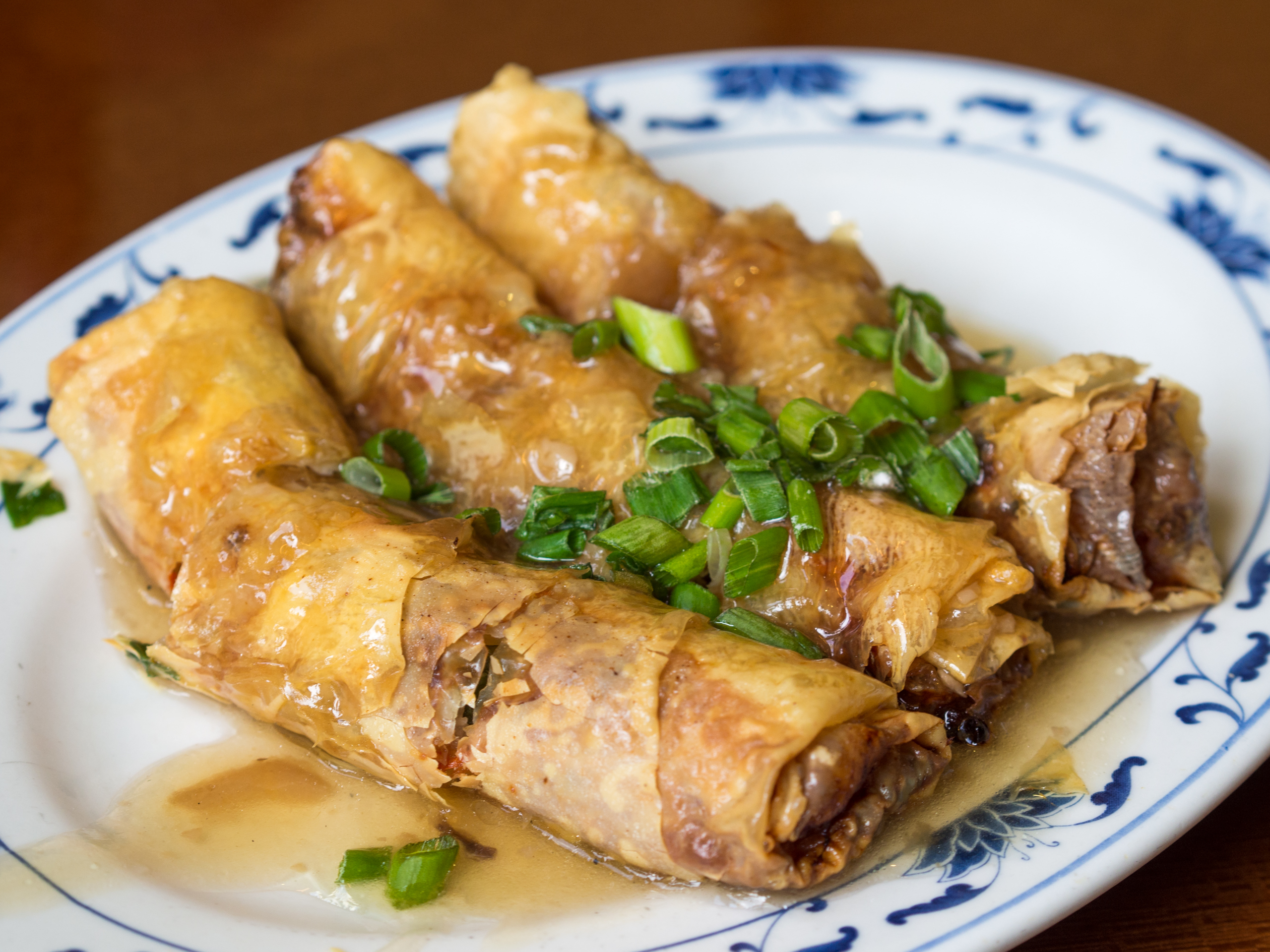 Description: Deep-fried tofu skin roll (炸腐皮捲, zaa fu pei gyun) with a minced pork and vegetable filling; at a dim sum restaurant in The Hague, Netherlands.
