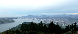 Description: Central Dunedin and the head of the Otago Harbour, New Zealand, as seen from Signal Hill