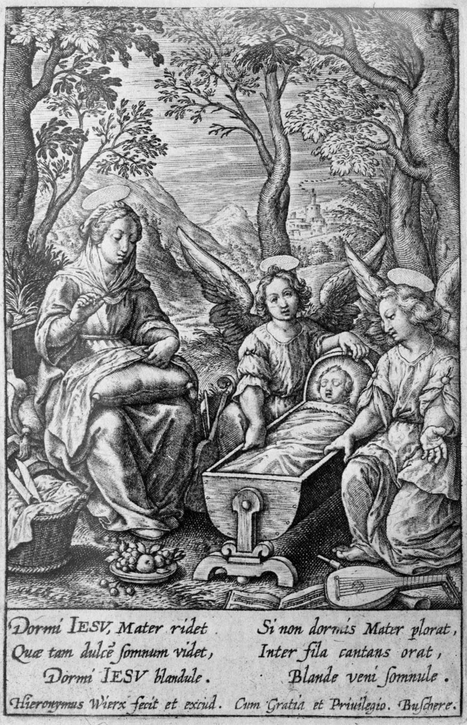 Description: "The Virgin Sewing While Angels Rock Her Son to Sleep", an engraving from by Hieronymus Wierix from Jesu Christi Dei Domini Salvatoris nostra Infantia. The woodcut was the source of S.T. Coleridge's poem "The Virgin's Cradle Hymn" of 1799.