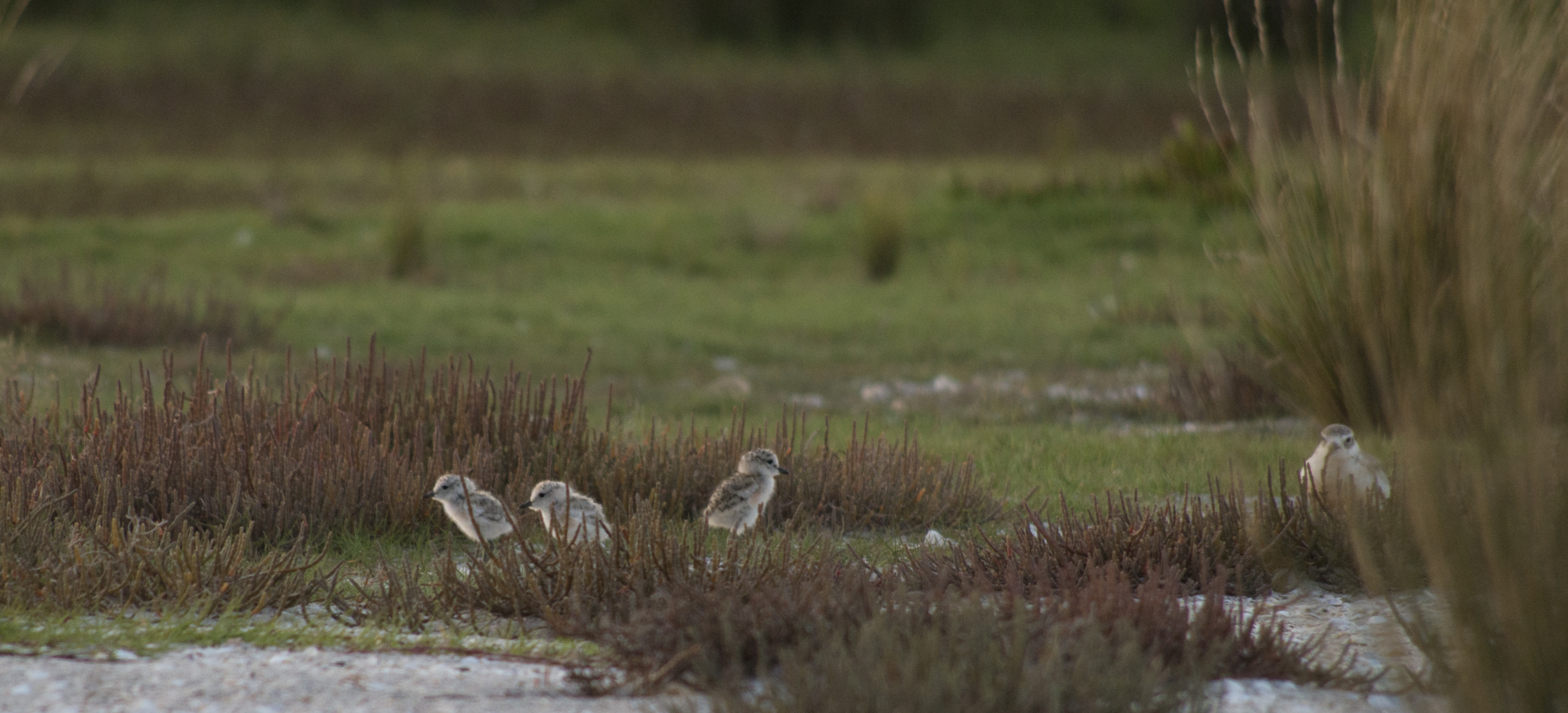 Description: Sur une plage à Ruakaka, dans un espace protégé, des pluviers roux ont eu trois petits.