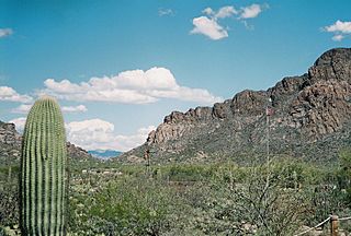 Description: The "Indian Chief's" profile (above windmill) on left side of Cat Mountain, overlooking the Double V Scout Ranch, Catalina Council, Boy Scouts of America South Kinney Road, Tucson, Arizona