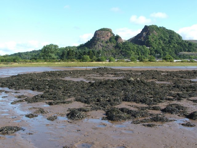 Description: Dumbuck Crannog from the south [See the end note for a summary of the crannog; for more detail, see the main description: 932217.] This photo shows the location of the crannog in relation to nearby features: the railway line (which runs close to the shore, just behind the grassy strip); the old Diamond Power site, whose roofs can be seen to the right; and, in the background, Dumbuck Quarry. As for the Crannog, care is needed to distinguish its original structure from more recent disturbances. For example, at its northern side (in the photo, this is directly below the left-hand peak of Dumbuck Quarry), a seaweed-covered heap of stones can be seen, and there are a few other heaps of stones at the site. These heaps are not part of the ancient structure of the crannog: rather, at some point between the 1898 archaeological dig and the later excavations in the 1990s, someone decided that it would be a good idea to shift some boulders around in order to create duck-shooting hides [see Hale and Sands, in the work cited at the link given in the first paragraph above].