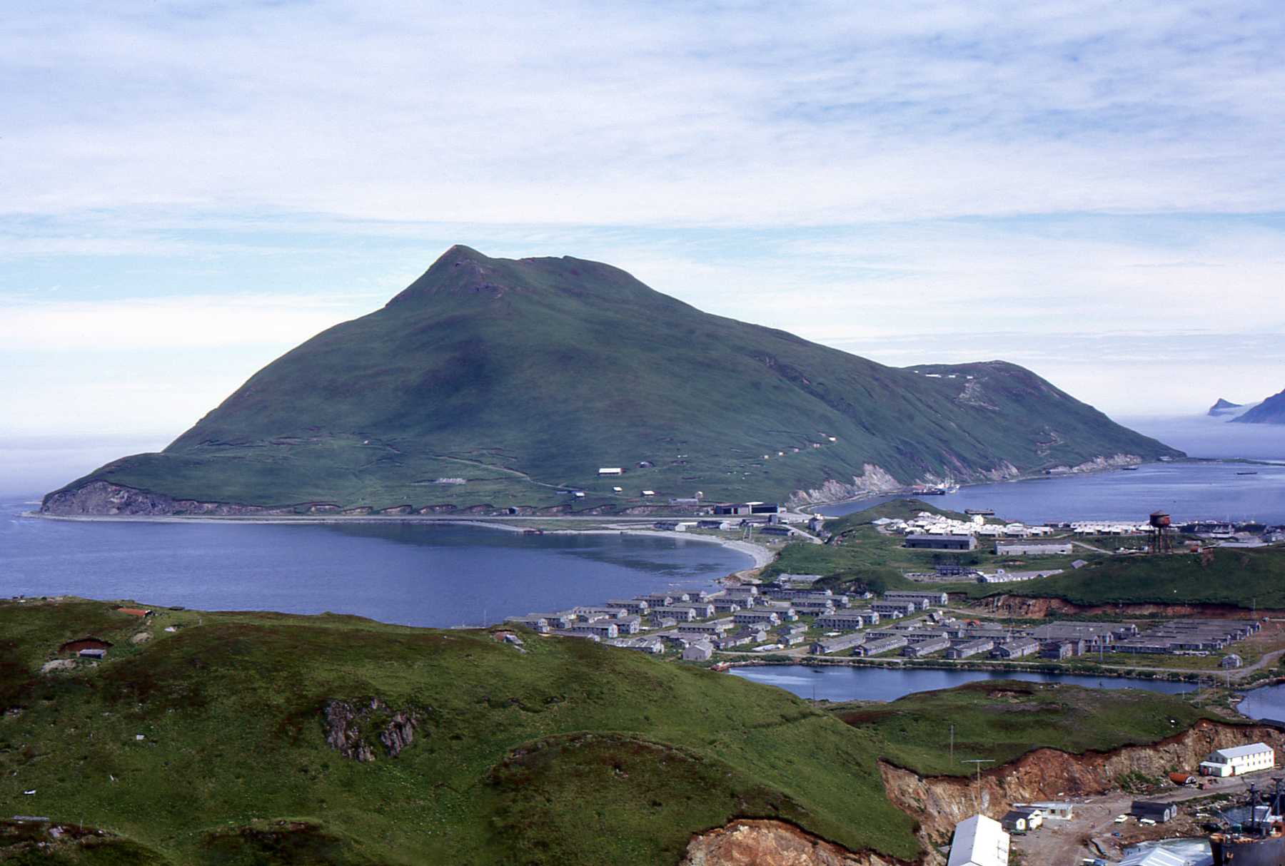 Description: United States of America, Alaska, Amaknak Island and the sight of what remains in 1972 before the cleanup of the late '80 of Dutch Harbor Naval Operating Base and Fort Mears, U.S. Army , in the background is Mount Ballyhoo.